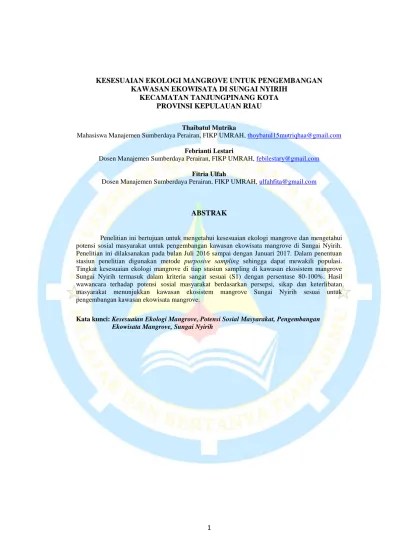 Tutupan kanopi mangrove dan kesesuaian lahan ekowisata mangrove. Industri, serta tingginya pencemaran dan sedimentasi dari lahan perkotaan. Tujuan penelitian ini adalah menginvestigasi kondisi ekologi dan tutupan mangrove di bahowo dan menganalisa kesesuaian lahan ekosistem mangrove sebagai . Antara kawasan konservasi penyu, mangrove, serta pariwisata. Contoh keong bakau dilakukan di laboratorium biologi.